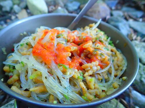 アツはナツい! そんな時はエスニック料理に限ります。 【材料】 ■ベジミンチ(大豆ミート)90g■乾燥たまねぎ 半玉分■顆粒コンソメ 小1■春雨 1袋 40g■青ネギ 1パック ※本当はピーマンがベスト■ガパオシーズニング 1袋 予め小袋にまとめ入れておくとラクです…